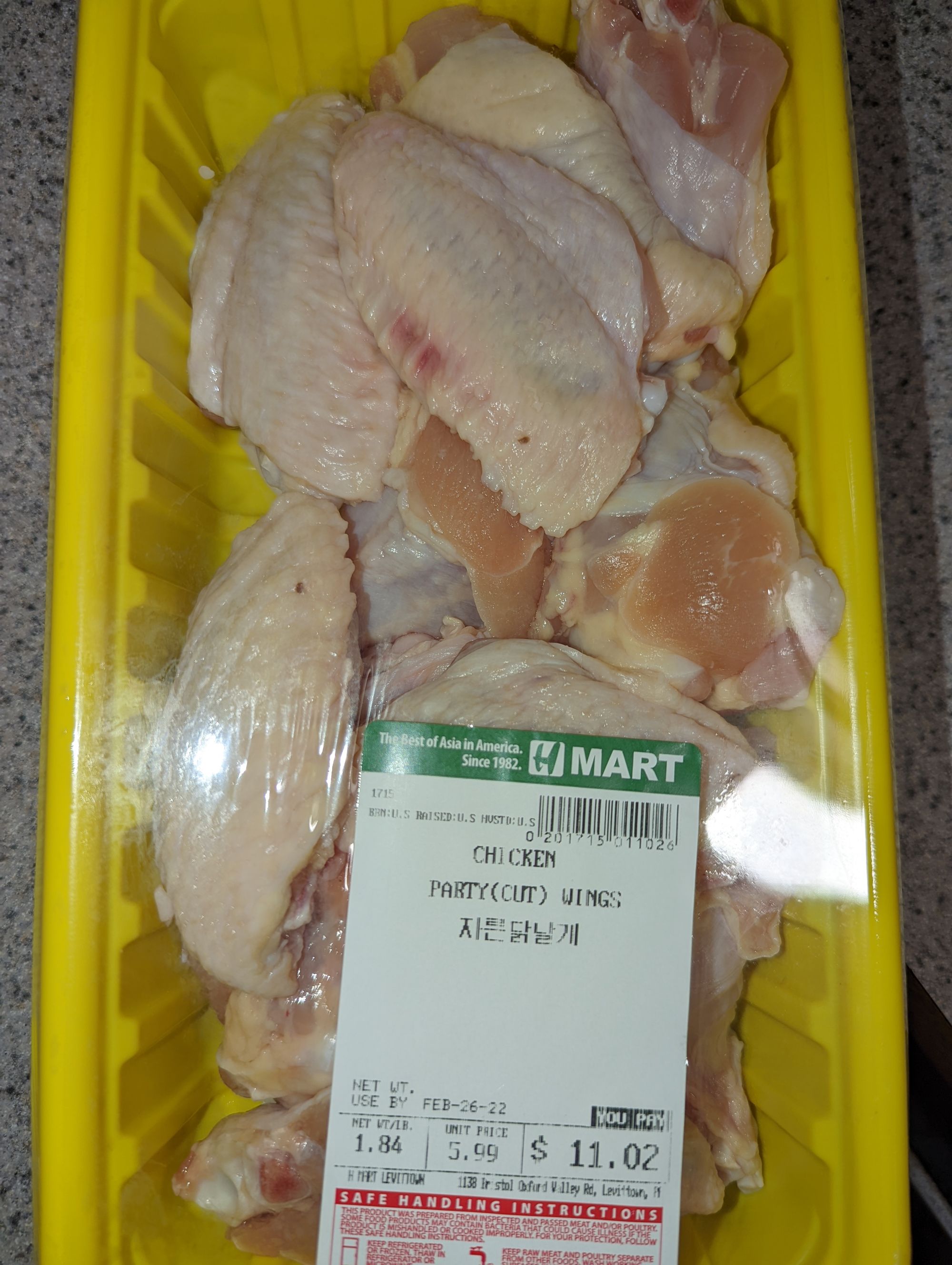 The wings I am using in this recipe came from H-Mart. They tend to sell the larger party-sized wings which I prefer already split. Worst-case, you can buy whole wings and split them yourself but buying the drums and flats already split is the easiest.