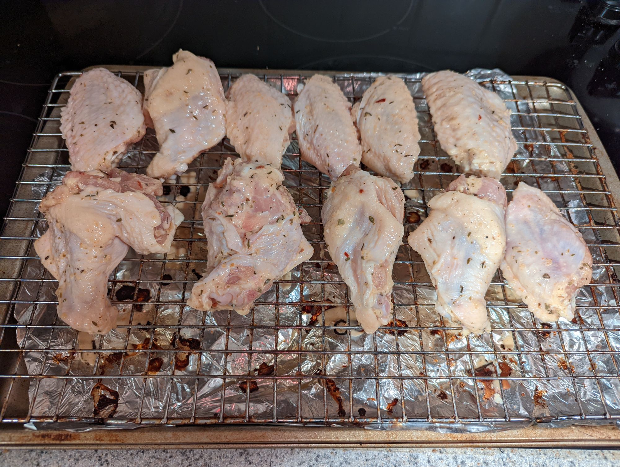 The mixture that is used to crisp the wings up is a combination of corn starch, baking powder, and my favorite seasonings (can go without seasonings if want to only sauce them afterwards), and water (water is added to ensure that all parts of the wing coated instead of the dry stuff falling off). I use a tablespoon or two or each but this depends on how many wings you are coating (it is not a precise measure). I like dry-rubbed wings most of the time but occasionally like to sauce them up with some Buffalo Sauce.